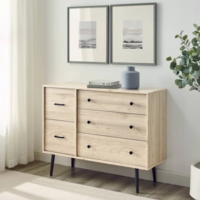 There are two sides to every dresser, and you can experience both with Saracina Home’s Ivora Mid-Century Modern Asymmetrical 5 Drawer Lifted Dresser. The left side is equipped with two deep drawers, perfect for your overflowing sock collection, and the right has three wide drawers where you can tuck clothing or linens. Telescoping metal glides make opening and closing all five drawers a breeze. Tapered, angled metal legs firmly support this mid-century modern storage chest, giving your bedroom a well-deserved style upgrade.