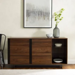 Shing Modern Striped Door 60″ Sideboard With Glass Shelves Dark Walnut – Saracina Home