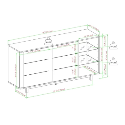 Make your mark with the Shing Modern Stripe Door 60” Sideboard with Glass Shelves by Saracina Home. The two cabinet doors feature striking black edges and beveled handles for a sleek, contemporary exterior. Adjustable, soft close door hinges make for a graceful closed storage experience. Tuck away games, extra place settings, or bar supplies inside the console so they’re at the ready for your next get-together. Complete this mixed material masterpiece when you display compelling decor on the two smoked, tempered safety glass shelves. Overall Product Dimensions: Height: 30” Width: 60” Depth: 15.75” Open Shelving Dimensions (without shelves) Height: 25.5” Width: 15” Depth: 15.75” Cabinet Dimensions: Height: 24.625” Width: 21.75” Additional Dimensions Leg Height: 3.875” Tabletop Thickness: 0.625”